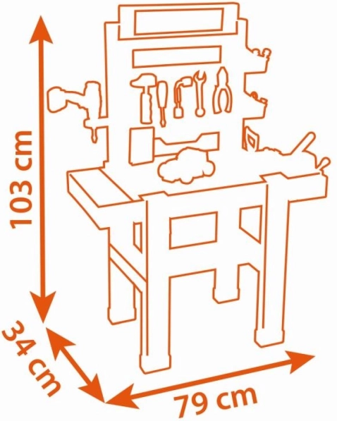 Tento licencovaný ponk BLACK+DECKER od francúzskeho výrobcu Smoby ponúka deťom autentický zážitok z dielne. Vďaka bohatej výbave, perforovanej nástenke na náradie, pevnému zveráku a dvom bočným krídlam s košmi majú malí kutili všetko na dosah a po ruke. Dielňa motivuje k učeniu hrou – deti môžu skrutkovať, zatĺkať, merať a stavať vlastné modely.