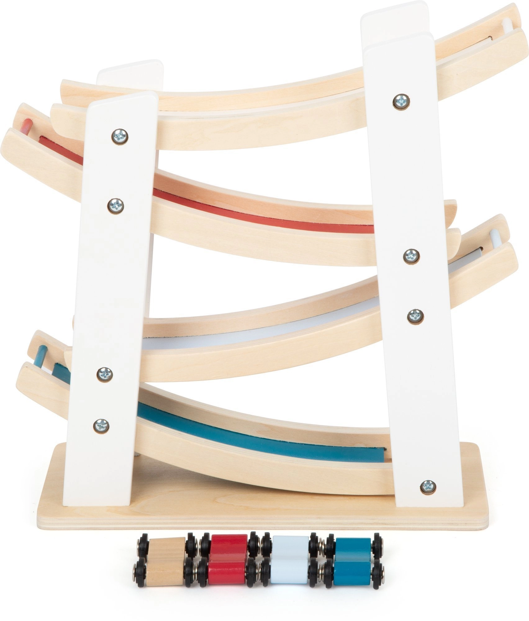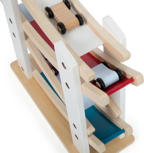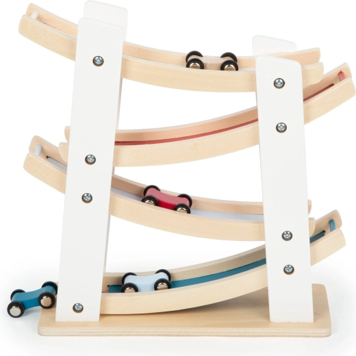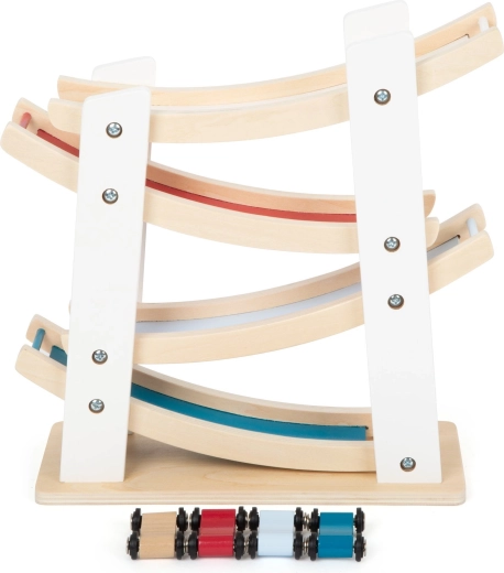 Táto kvalitná drevená dráha ponúka jednoduchý princíp, ktorý deti milujú: položte autíčko na horné poschodie a sledujte, ako svižne kĺže po krivkách až dole. Stabilná základňa a hladké povrchy zaručujú bezpečné a dlhodobé používanie.