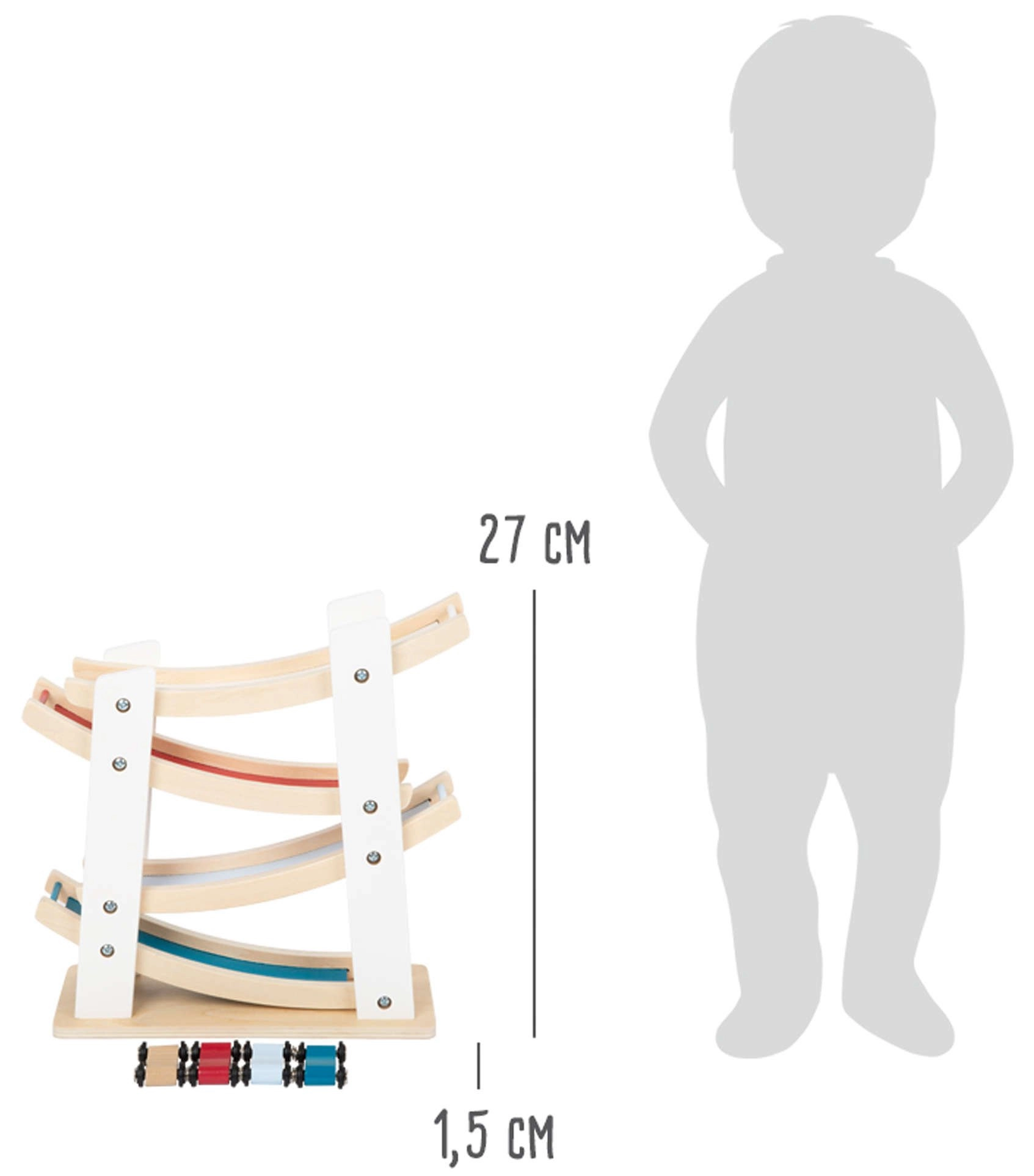 Dráha je vyrobená z kvalitného prírodného dreva so stabilnou základňou a hladkými hranami pre bezpečné hranie malých detí.