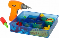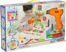 Zábavná vzdelávacia stavebnica pre malých kutilov s elektrickou hračkárskou vŕtačkou, skrutkami a mozaikovou doskou. Deti si precvičia jemnú motoriku, kreativitu a technické myslenie pri skladaní farebných vzorov aj vlastných konštrukcií. Praktický kufrík uľahčí prenášanie a bohatá sada 261 dielov zabezpečí hodiny skvelej hry.