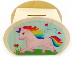 Táto farebná pokladnička s jednorožcom motivuje deti k finančnej gramotnosti a učeniu sa hodnote peňazí. Robustné spracovanie z prírodného dreva zaručuje dlhú životnosť a príjemný prírodný vzhľad, ktorý krásne zapadne do detskej izby.