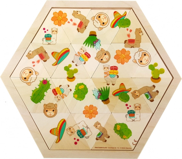 Zábavná drevená mozaika s motívom lamy pre deti od 3 rokov. Obsahuje 24 farebne potlačených dielikov v praktickom drevenom ráme. Podporuje jemnú motoriku, koncentráciu a zručnosti pozorovania, porovnávania a priraďovania motívov.