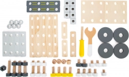 Súčasťou balenia je bohaté príslušenstvo: konštrukčné lišty a dosky s predvŕtanými otvormi, kocky, kolesá, adaptéry kolies, dištančné puzdrá a dva drevené nástroje – kľúč a skrutkovač. Všetko prehľadne uložíte do praktického boxu, takže sa žiadny dielik nestratí.