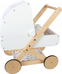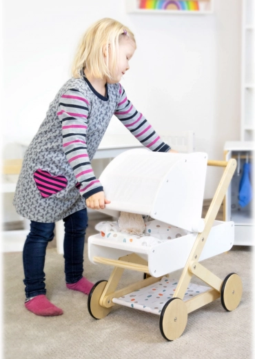 Objavte kvalitný kočík pre bábiky, ktorý skvele zapadne do každého detského izbičky. Kombinuje prírodné drevo, odolné a umývateľné textílie a jemnú paletu farieb. Nízka hmotnosť a stabilná konštrukcia zaručí bezpečnú jazdu, zatiaľ čo pogumované kolieska sa postarajú o tichú prevádzku na akomkoľvek povrchu.