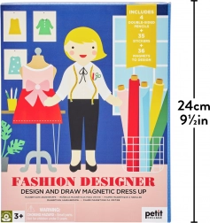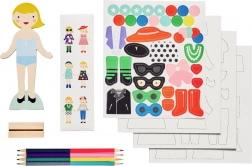 Hračka obsahuje magnetickú figúrku s dreveným stojanom, 36 magnetických dielikov oblečenia, 4 obojstranné pastelky a 35 nálepiek, čo umožňuje vytvorenie viac než 100 rôznych outfitov. Deti môžu vyjadriť svoju kreativitu a rozvíjať svoju predstavivosť vďaka rôznorodosti dielikov a možnostiam kombinovania. Krabička slúži nielen ako úložný priestor, ale tiež ako príjemné pozadie pre hru, čo spôsobuje, že celý zážitok je komplexný a estetický.