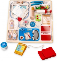 Deti sa zábavnou formou učia rozpoznávať stetoskop, teplomer, injekciu a ďalšie pomôcky a správne ich vkladať na svoje miesto.
