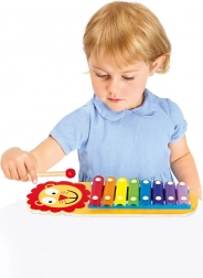 Detský xylofón s veselým motívom levíčika prináša zábavné učenie aj kreatívne hranie. Osem farebných kovových plieškov na drevenom základe znie jasne a príjemne, takže deti ľahko objavujú tóny, rytmus aj prvé melódie. Súčasťou balenia sú dve drevené paličky na pohodlné hranie oboma rukami.