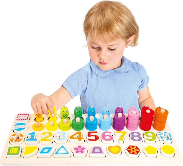Pomocou farebných tvarov a číslic hračka podporuje učenie sa základom počítania a rozpoznávaniu tvarov.