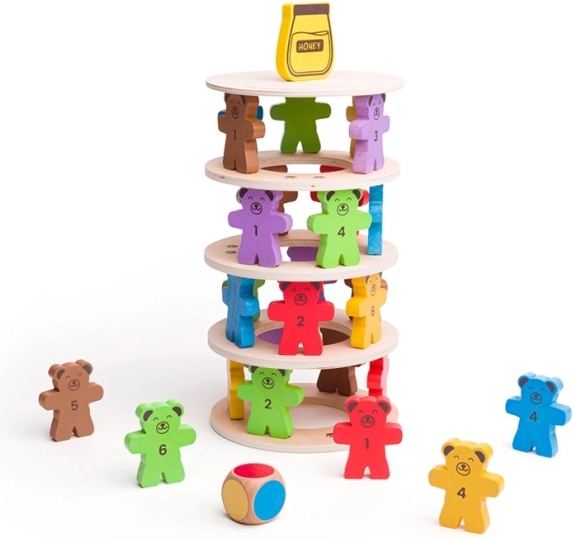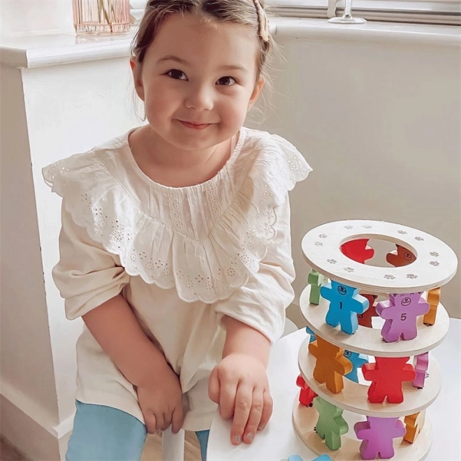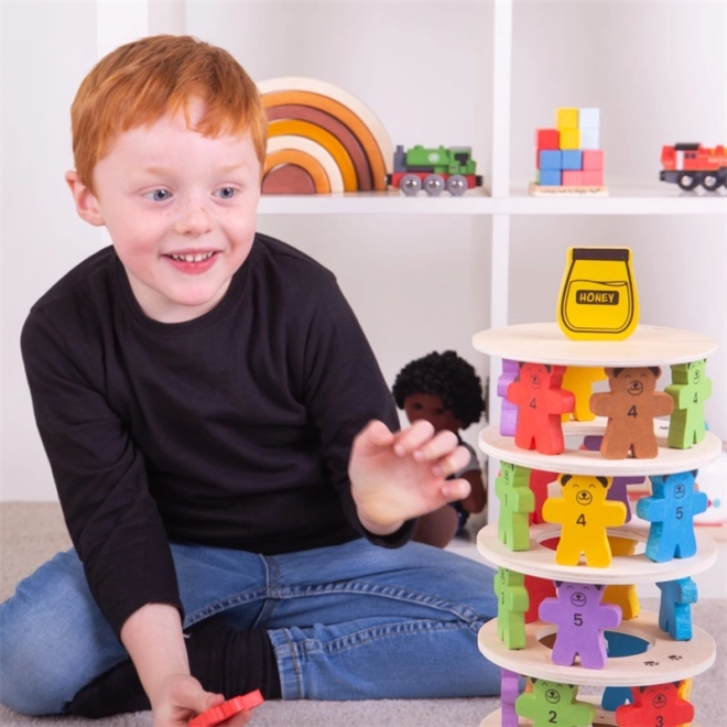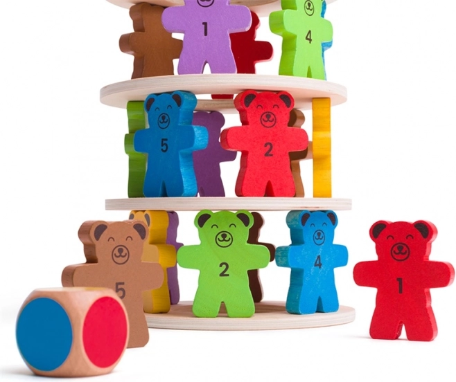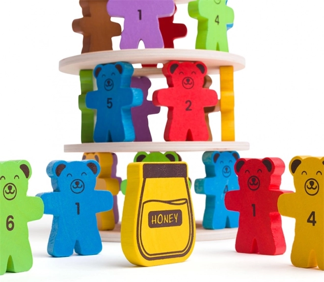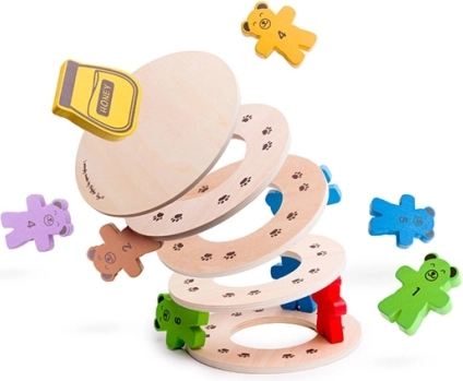 Drevená vyvažovacia hra Padajúci Medvedíci, ktorá deti nielen zabaví, ale aj naučí. Pomocou medvedích figúrok tvorte stabilnú vežu a precvičujte jemnú motoriku a rozpoznávanie čísel.