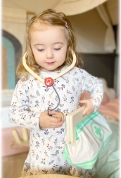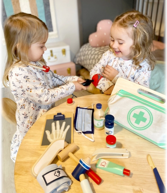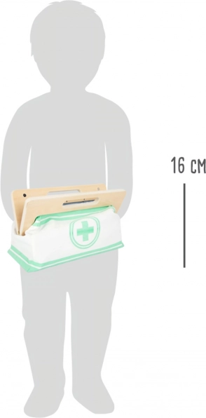 Súčasťou je bohaté príslušenstvo: stetoskop, teplomer s nastaviteľnou teplotou, injekčná striekačka s pohyblivým mechanizmom, otoskop so skutočnou lupou, ale aj tlakomer s manžetou a balónikom, dezinfekcia s pumpičkou, fľaštičky, lyžička, pinzeta, skalpel, reflexné kladivko a textilné rúška. Deti si vyskúšajú ošetrenie „pacienta“, naučia sa základom starostlivosti a odbúrajú strach z návštevy lekára.