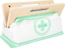 Táto starostlivo spracovaná lekárska sada kombinuje prírodné drevo a kvalitný textil do bezpečnej a zábavnej hračky pre deti od 3 rokov. Praktická brašňa s magnetickým zapínaním udrží všetky nástroje pokope a vďaka výraznému zelenému krížu je vždy ľahko na nájdenie.