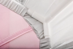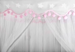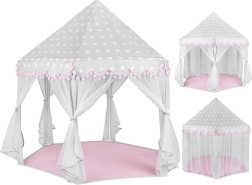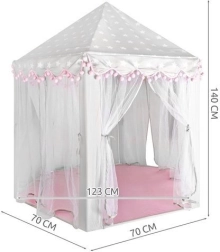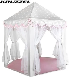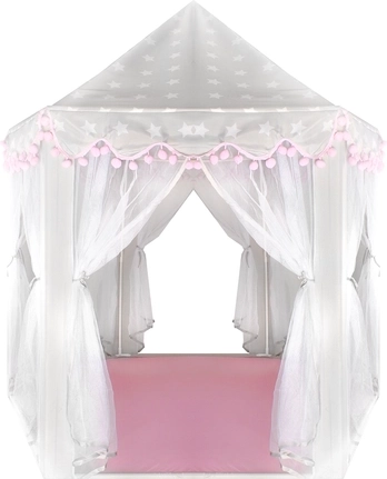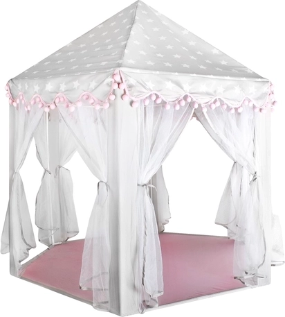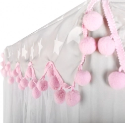 Priestranná podložka a vzdušné bočnice zabezpečia komfort pre jedno aj viac detí – zmestí sa sem veľa vankúšikov, plyšákov aj knižiek. Stan sa skvele hodí do interiéru aj na záhradu pod dohľadom dospelých. Dekoratívne pompony a možnosť zaviazania zácloniek na mašle dodajú hre šmrnc aj súkromie.