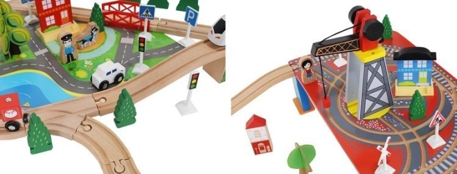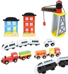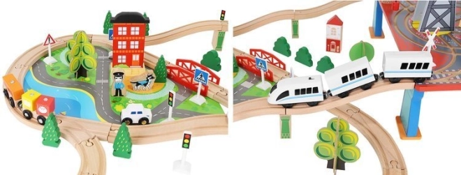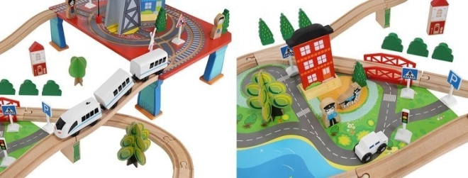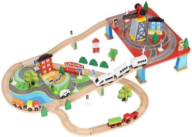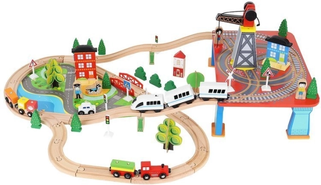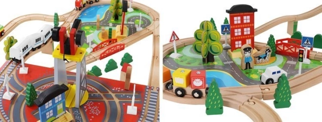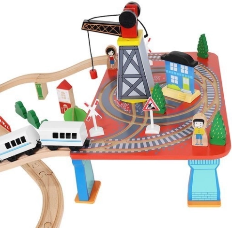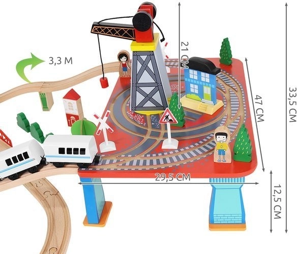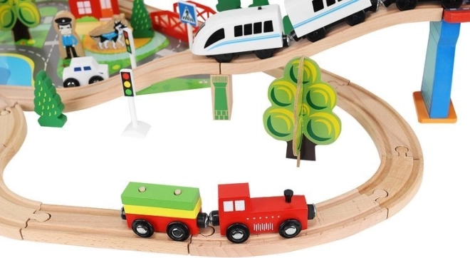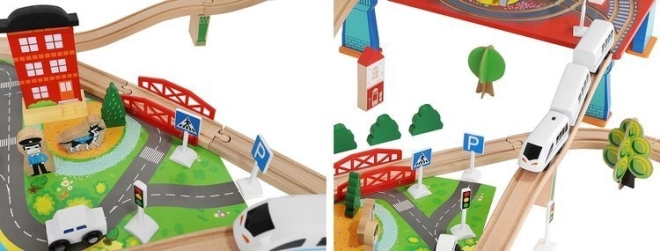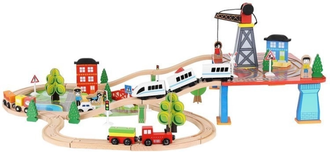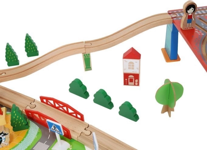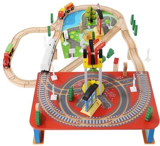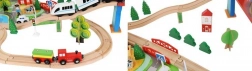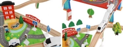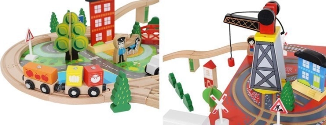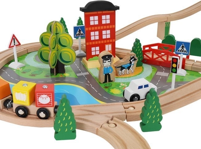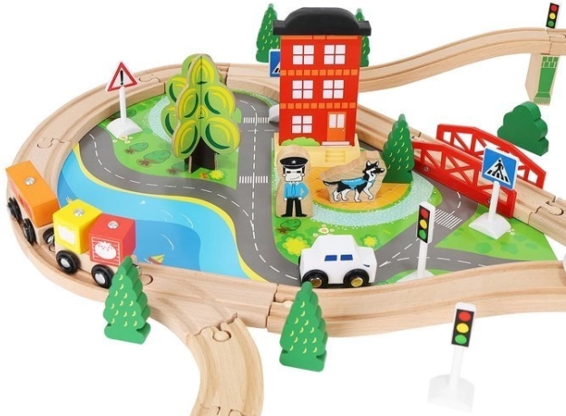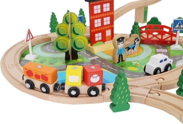 Drevená vlaková dráha s celkom 88 precízne vyrobenými prvkami, vrátane železnice, nákladného a osobného vlaku, automobilu, stromčekov a dopravných značiek. Zábava spočíva v možnosti vytvoriť si vlastnú trasu, zatiaľ čo magnetické spojenia jednotlivých častí zaisťujú jednoduchú obsluhu.