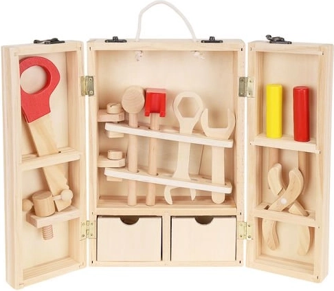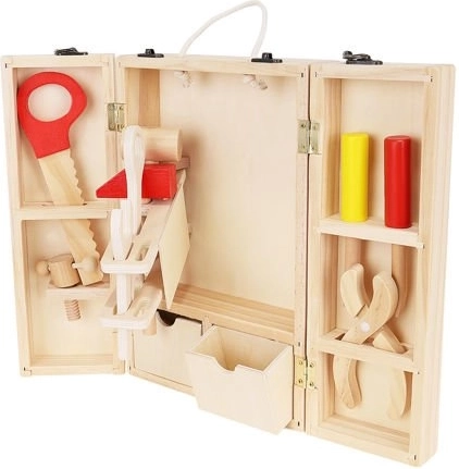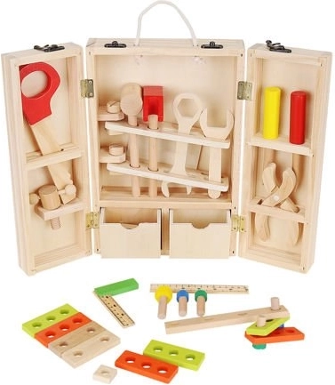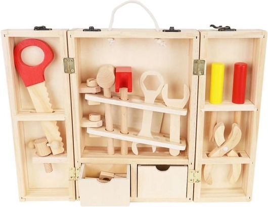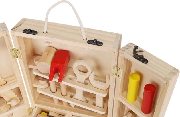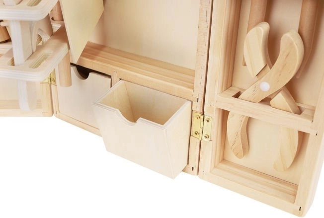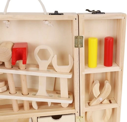 Okrem správnych nástrojov sú vo vnútri krabice aj doplnky, ako sú drevené dosky s otvormi, matice a skrutky. Zostáva v krásnych, živých farbách, priťahuje oči a vyzýva dieťa, aby sa hralo. Perfektné ako darček pre kreatívne chlapcov a dievčatá. Celok je vyrobený z prírodného dreva s dôrazom na najmenšie detaily, ktoré stimulujú detskú fantáziu od útleho veku a pomáhajú zoznámiť sa s vlastnosťami rôznych predmetov. Súpravu možno ľahko udržiavať v čistote otieraním puzdra a príslušenstva vlhkým handričkom.