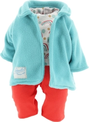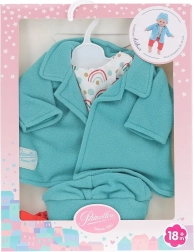 Oblečenie Petitcollin Arthur premení každú bábiku s veľkosťou 36 cm na elegantného parťáka na hranie. Súprava kombinuje tyrkysovú flísovú mikinu, veselú vzorovanú blúzku, červené krátke nohavice a ladiacu čiapočku – spolu vytvára atraktívny a pohodlný outfit na každodenné dobrodružstvá.