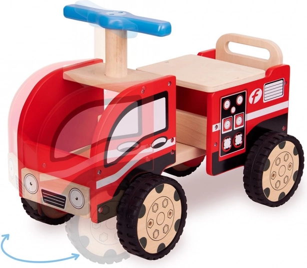 Drevené odrážadlo v tvare hasičského auta s reálnymi detailami podporí zábavu a inšpiruje k imaginatívnej hre.