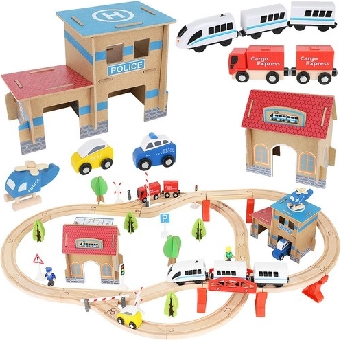 - Kompletný set s 89 dielmi – zahŕňa trate, vlak, 2 autá, policajný vrtuľník, nákladné vozidlo, stanicu a ďalšie príslušenstvo.