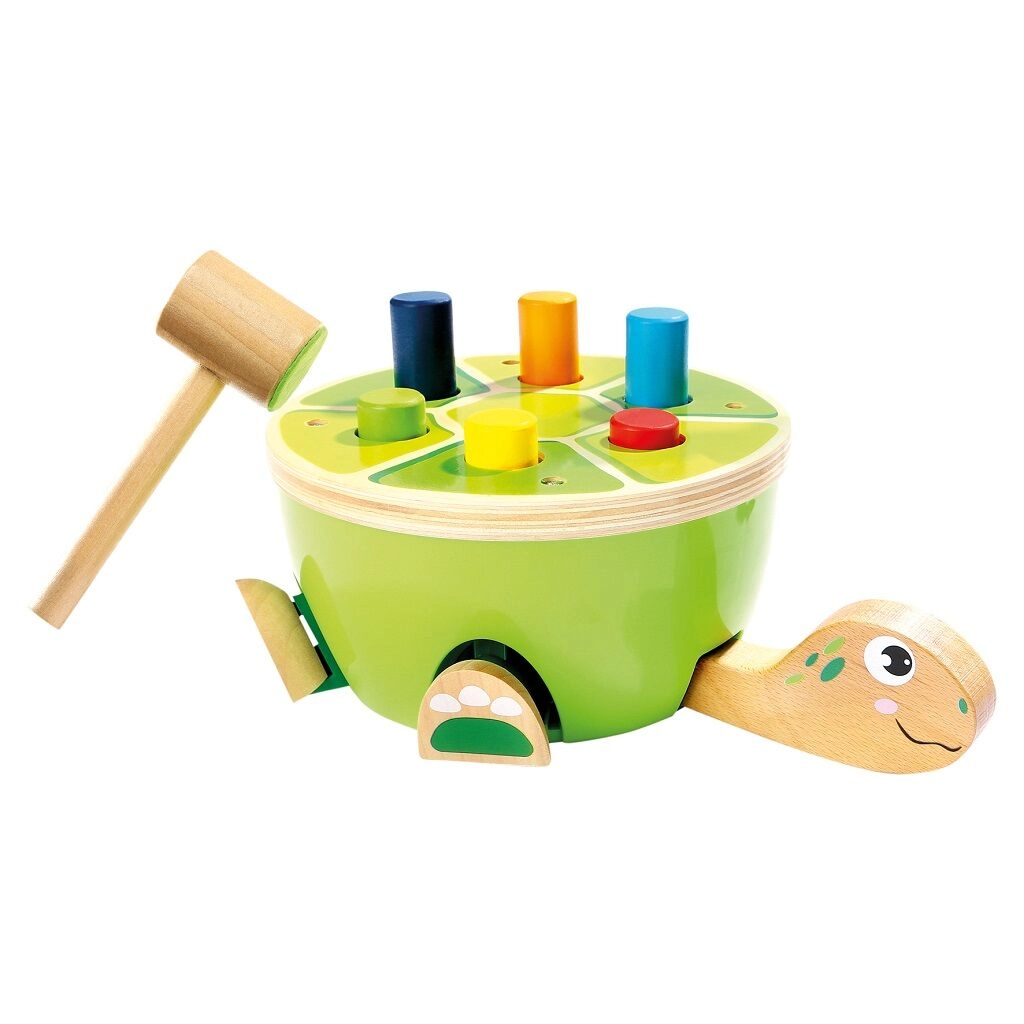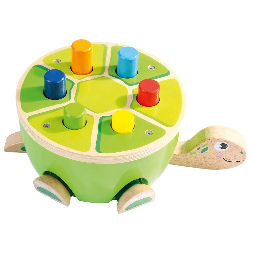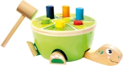 Zábavná drevená zatĺkačka v tvare korytnačky, ktorá rozvíja detskú jemnú motoriku, koordináciu ruka–oko a sústredenie. Farebné kolíčky sa zatĺkajú do panciera pomocou kladivka s plsteným povrchom pre tichšiu hru, pričom korytnačke „ožívajú“ nohy a hlava – skvelý spôsob, ako podporiť zvedavosť a radosť z objavovania.