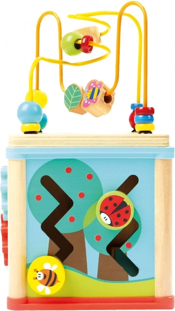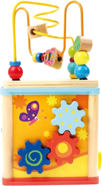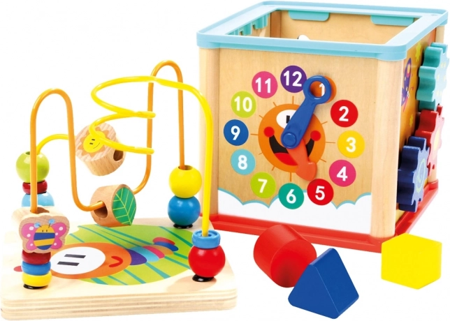 Táto farebná drevená motorická kocka ponúka deťom od 12 mesiacov mnoho spôsobov, ako sa hrať a zároveň sa učiť. Vďaka hodinám s ručičkami sa deti hravou formou zoznámia s časom, korálkový labyrint rozvíja úchop a koordináciu a ďalšie strany kocky precvičujú logiku, tvary aj farby.