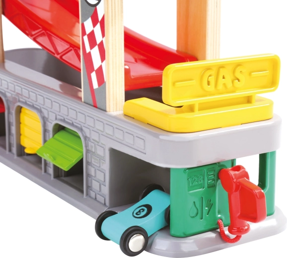 Stabilná konštrukcia z odolných materiálov vydrží každodennú hru, zatiaľ čo praktické garáže poslúžia aj na ukladanie a prenášanie autíčok. Jasné farby a číslované úrovne pomáhajú s rozpoznávaním farieb a základným počítaním. Súčasťou balenia sú štyri hladko pojazdné autíčka na okamžité pretekanie.