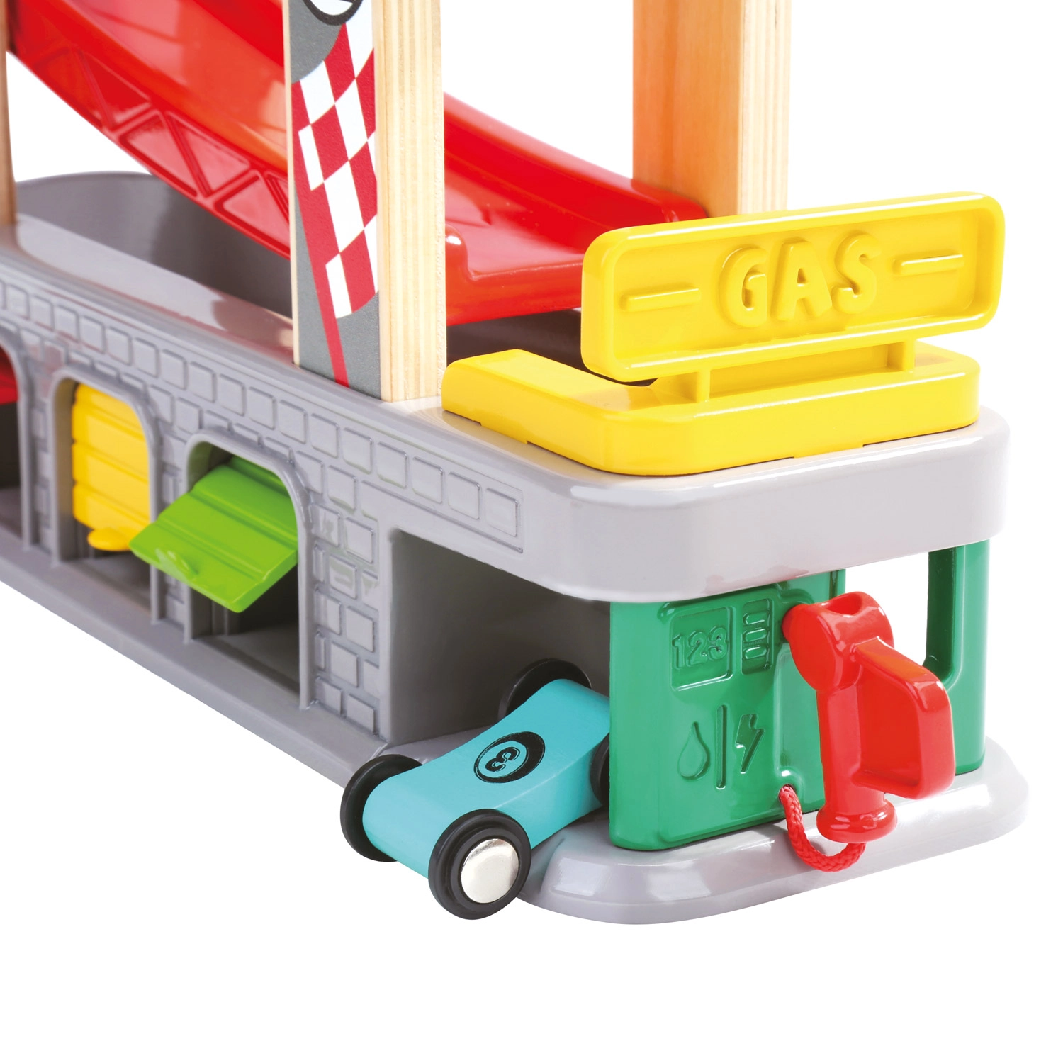 Rozbehnite preteky naplno s autodráhou, ktorá ponúka dvojicu štartovacích plošín, boxy na tankovanie a tri garáže s otvárateľnými dvierkami. Robustná kombinácia drevá, plastu a kovu zaručuje odolnosť, zatiaľ čo živé farby priťahujú pozornosť a podporujú detskú fantáziu. Súčasťou sú 4 rôznofarebné autíčka pre nekonečnú porciu pretekárskej zábavy.