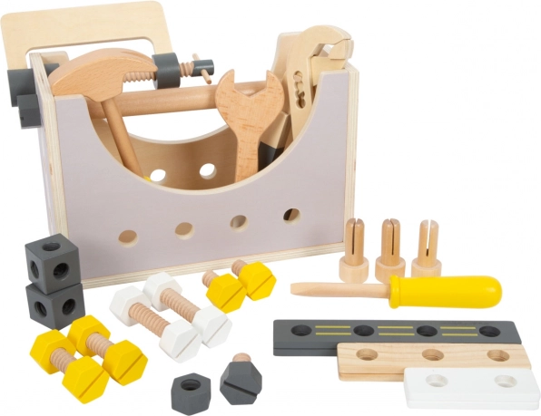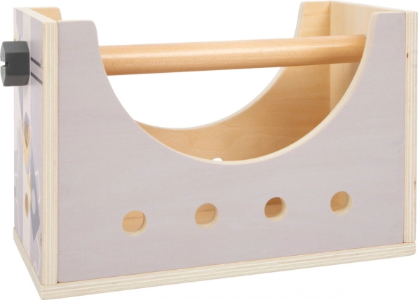 Súčasťou je 5 kusov dreveného náradia – kladivo, kľúč, skrutkovač, hasák a zverák – plus dostatok doplnkov na kreatívne projekty. Odnímateľná rukoväť a praktické otvory umožnia náradie rýchlo uložiť, takže je debnička ideálna aj na cesty.