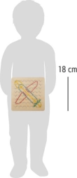 Drevená tabuľa Geoplan je vybavená 64 rovnomerne rozmiestnenými kolíčkami na pevnej drevenej základni o rozmeroch 18 x 18 x 2 cm. Vďaka 48 farebným gumičkám môžu deti vytvárať nekonečné množstvo vzorov a obrazcov od jednoduchých geometrických tvarov po zložité kompozície. Súčasťou sady sú aj 23 vzorových kariet, ktoré pomáhajú precvičovať priestorové plánovanie a logické myslenie.
