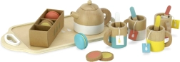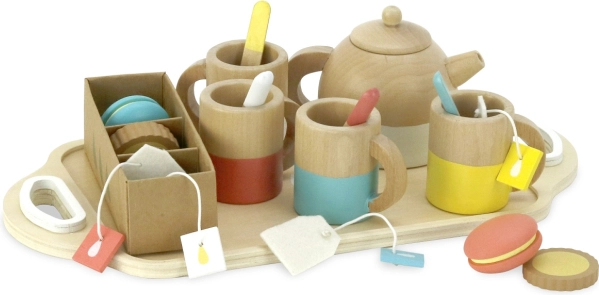 Súprava obsahuje: 4 šálky, 4 lyžičky, 1 kanvicu, 4 čajové vrecká, 2 makrónky, 4 sušienky v krabičke a 1 podnos. Všetko je vyrobené z kvalitného dreva s hladkými hranami pre bezpečnú a dlhotrvajúcu hru. Podporuje rozvoj fantázie, reči a sociálnych zručností.