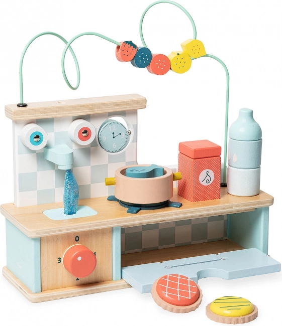 Táto kvalitná drevená kuchynka VILAC kombinuje motorické aktivity s realistickými kuchynskými prvkami. Deti môžu otáčať gombíkmi, otvárať dvierka rúry, „variť rybu“ v hrnci a púšťať vodu v dreze, zatiaľ čo farebný labyrint s ovocím a stohovateľná soľ a fľaša podporujú fantáziu a koordináciu oko-ruka.