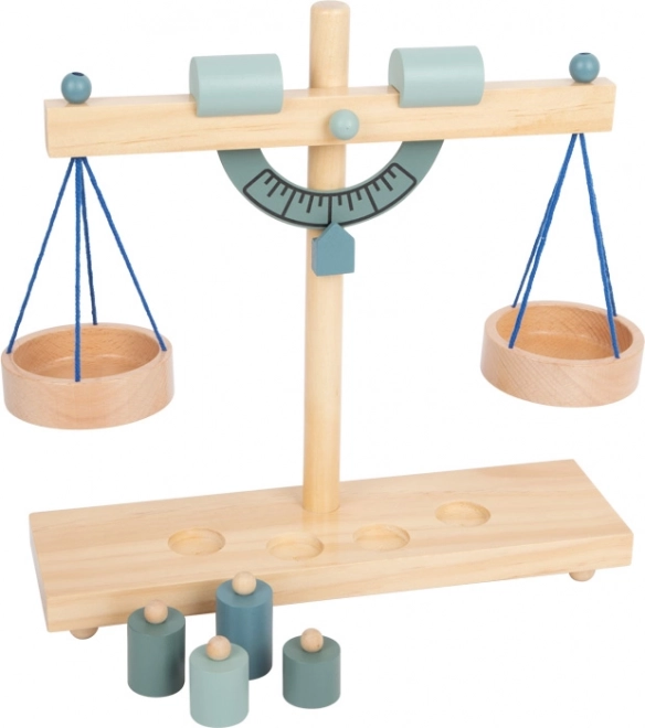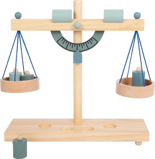 Deti ľahko pochopia princíp vyvažovania vďaka dvom miskám a štyrom dreveným závažiam v rôznych hmotnostiach.