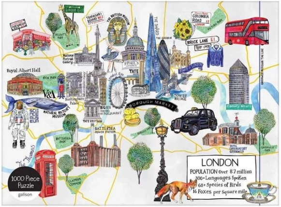 Toto dizajnové puzzle prináša pestrú a detailnú mapu LONDÝNA s ikonickými pamiatkami, ako sú Buckingham Palace, Trafalgar Square, Royal Albert Hall, Tower Bridge alebo London Eye. Štýlové balenie s matným povrchom poteší ako darček aj ako dekoratívny kúsok do knižnice. Autor ilustrácie: Hennie Haworth.