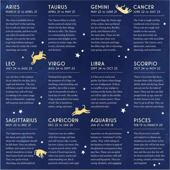 Každé znamenie zverokruhu je unikátne zobrazené a prináša esenciu daného znamenia v hravom mačacom štýle.