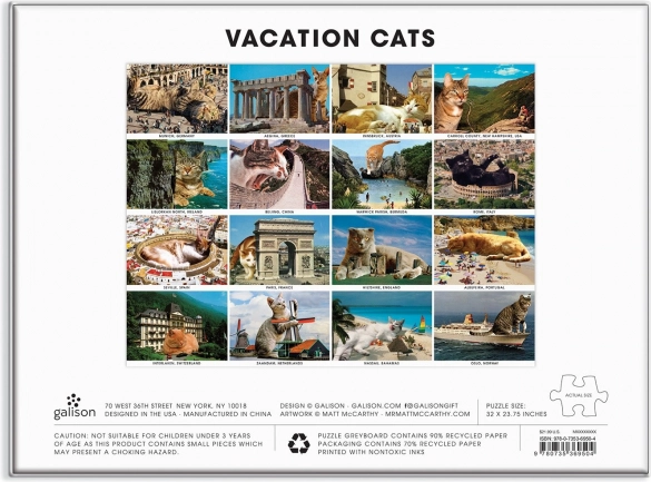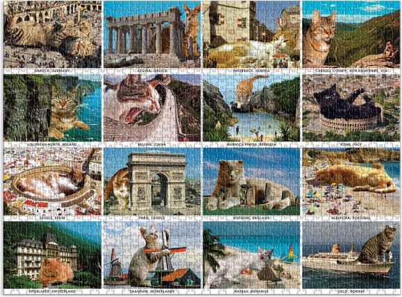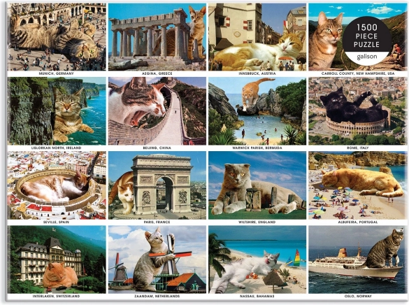 Vtipné puzzle s mačkami na prázdninách o 1500 dielikoch ponúka zábavu a relax. Obsahuje šestnásť realistických fotografií, v ktorých si môžete vychutnať mačky kochajúce sa známymi miestami sveta.