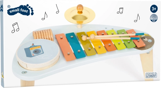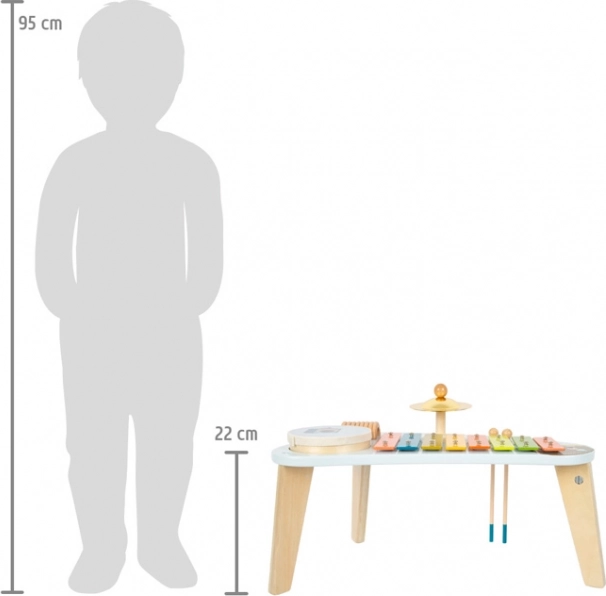 Hudobný stolík Groovy Beats small foot je premyslený set pre prvé muzikantské krôčiky. Vďaka pevnej drevenej konštrukcii a trom stabilným nohám zvládnu deti bezpečne skúmať rôzne zvuky – od melodických tónov xylofónu cez jasné cinknutie činelov až po beaty odnímateľného bubna. Farebne kódované klapky zjednodušujú učenie a podporujú rýchle úspechy.