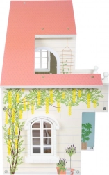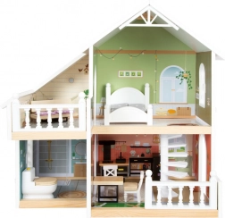 Štýlový drevený domček pre bábiky s otvorenou prednou stranou ponúka tri miestnosti, terasu a záhradku pre realistickú hru. Nechýba točité schodisko, otvárateľné okná, moderná kúpeľňa s plexi stenou a 8 ks funkčného nábytku s textilnými doplnkami. Kompaktné a stabilné spracovanie v svetlom, modernom dizajne je ideálne do detskej aj obývacej izby.