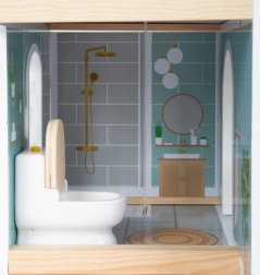 Súčasťou je 8 kusov nábytku a praktické detaily pre autentickú hru: otvárateľná toaleta, kuchynské skrinky a chladnička s dvierkami i zásuvky. Textilné vankúše a obliečky dodajú spálni útulnosť, zatiaľ čo točité schodisko prepája dve poschodia s premysleným interiérom a plexi stenou sprchy.