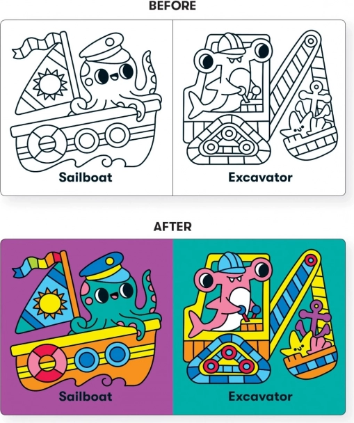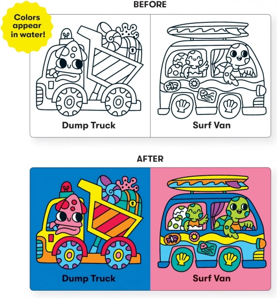- Interaktívny farebný efekt – obrázky sa po namočení rozjasnia a zvýraznia.