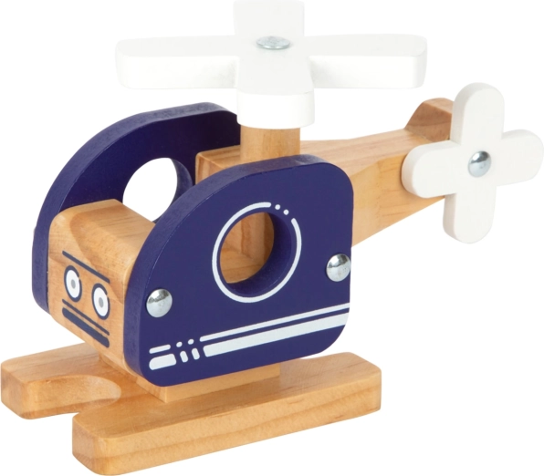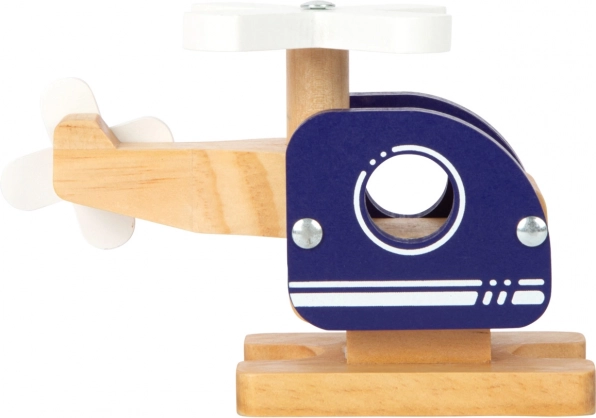 Drevená helikoptéra má prirodzenú drevenú úpravu s modrými a bielymi detailmi, čo jej dodáva hravý vzhľad a činí ju bezpečnou pre deti.