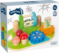 Drevená doska ponúka rôzne pohyblivé prvky ako ozubené kolieska a hubičky na rozvoj jemnej motoriky.