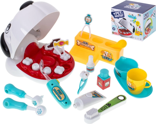 Sada zahŕňa kefku na zuby, zrkadlo, dosku na príslušenstvo a ďalšie nástroje pre realistické hranie.