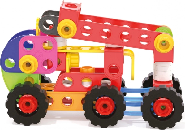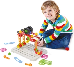Skrutky, matice a dierované doštičky sa ľahko spájajú a držia. Deti si postavia autá, traktory, žeriavy aj vlastné modely – jednoducho a bezpečne.