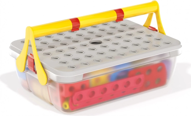 Všetky diely uložíte do pevného boxu s rukoväťou. Perforované veko slúži ako stavebná plocha – ideálne na doma aj na cesty.