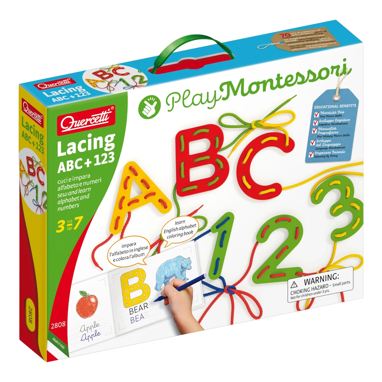 Farebné písmená a číslice s otvormi na navliekanie podporujú rozpoznávanie tvarov, skladanie prvých slov a zoznamovanie sa s číslami prirodzenou, zábavnou formou.