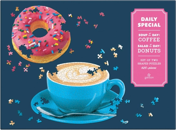 Užite si dvojitú porciu zábavy so špeciálnou sadou puzzle 2 v 1 s motívmi ružového donutu a šálky cappuccina. Nepravidelne tvarované dieliky presne do seba zapadajú a zabezpečujú plynulé skladanie. Puzzle je zabalené v pevnej, štýlovej krabici – ideálne ako darček. Približne 625 dielikov, kvalitná tlač a originálne tvary pre ešte lepší zážitok zo skladania.