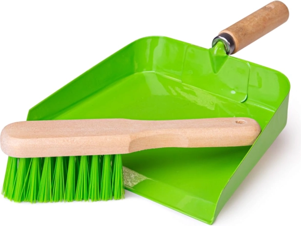 Sada lopatky a metličky je vyrobená z kvalitných materiálov, ako je drevo a plast, ktoré sú zodpovedne získané a spracované pre bezpečné použitie.