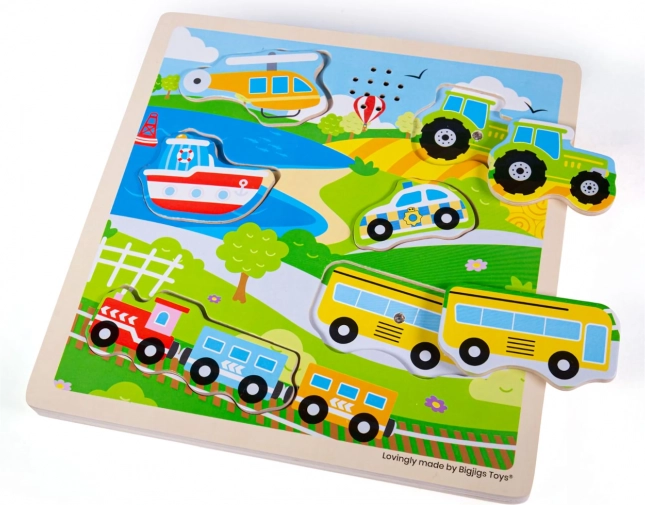 Zábavná drevená vkladačka pre deti s motívom dopravných prostriedkov, ktorá po uloženie dielu na správne miesto prehrá zvuk charakteristický pre daný stroj, a tak rozvíja detské poznávacie schopnosti.