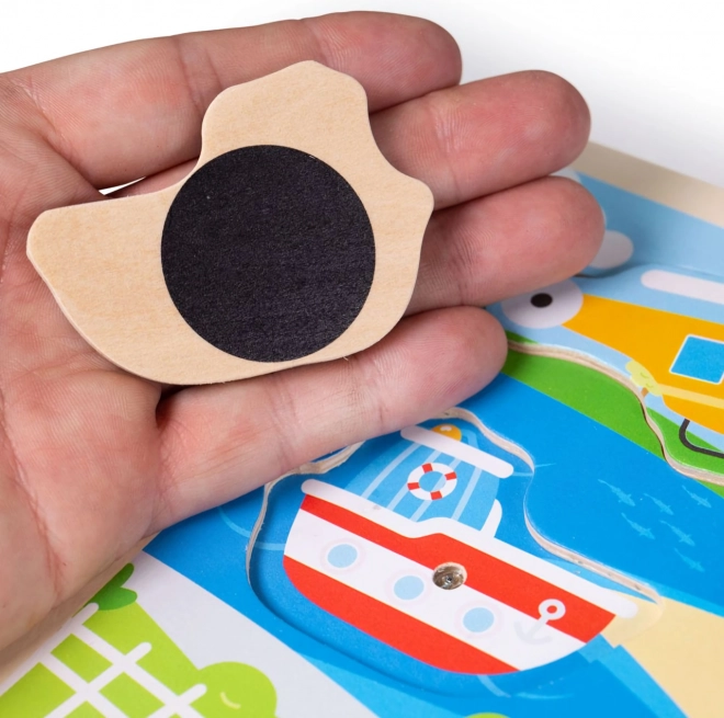 S touto drevenou vkladačkou môžu deti nielen zábavne rozpoznávať rôzne tvary a dopravné prostriedky, ale tiež sa tešiť zo zvukov, ktoré jednotlivé diely vydávajú. Tento interaktívny prvok pomáha deťom rozvíjať motorické zručnosti a priestorové vnímanie.