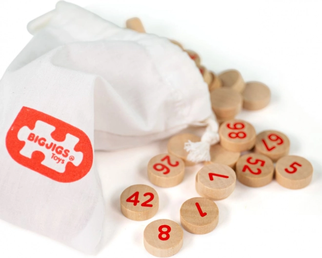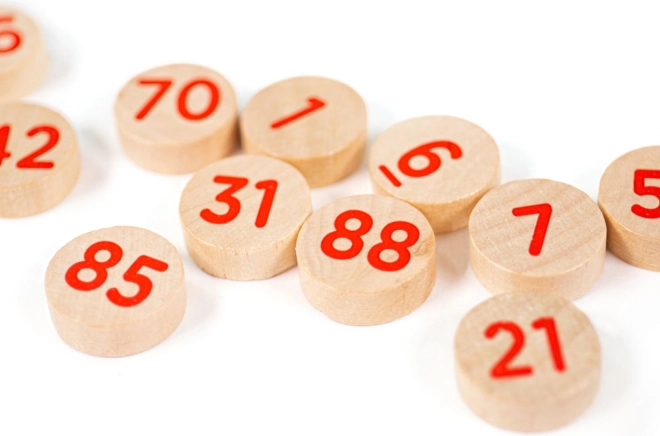 Žetóny sú vyrobené z prírodného dreva a označené jasne červenými číslami pre ľahké čítanie.