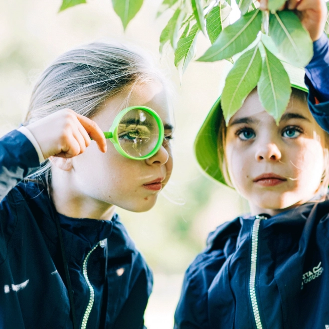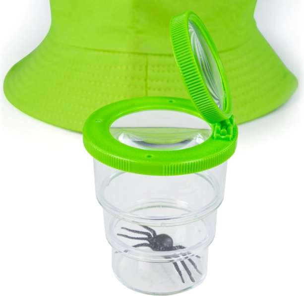 Lupa a priehľadná nádobka s viečkom umožnia deťom skúmať detaily úplne zblízka a pritom šetrne voči prírode.