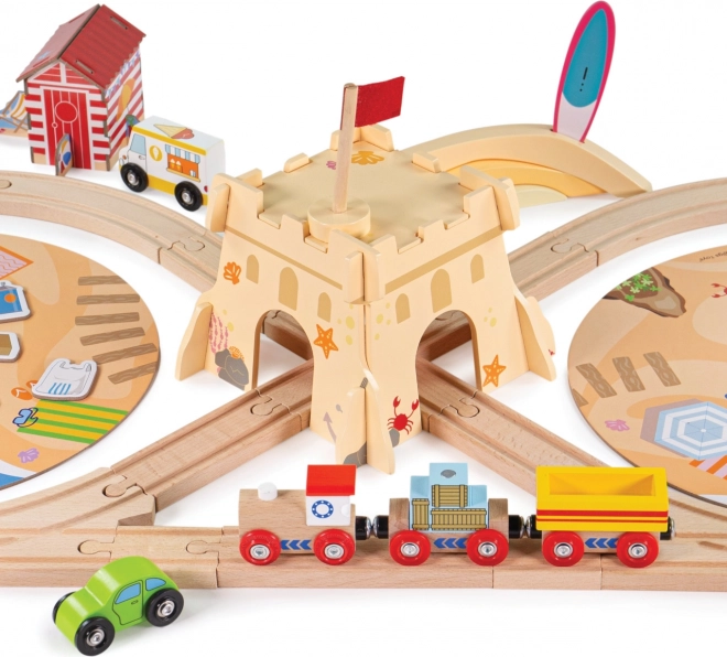 Táto pobrežná vláčkodráha prináša množstvo nápaditej zábavy aj vzdelávania v jednom. Deti môžu krúžiť po dráhe, prechádzať veľkým hradom z piesku, míňať farebné plážové domčeky a pritom sa učiť triediť odpad vďaka praktickým magnetickým zatváracím doskám. Všetko v kvalitnom prevedení zo zodpovedne získaných materiálov s nezávadnými farbami a lakmi.